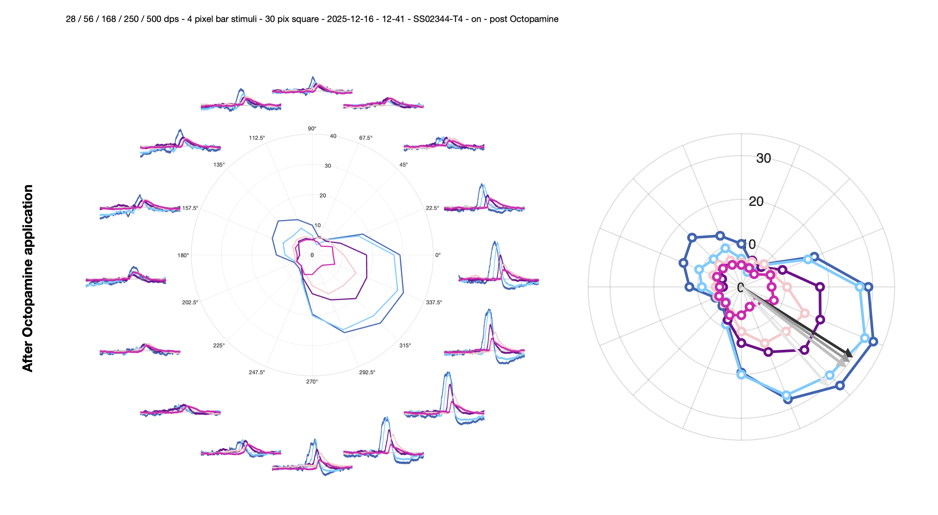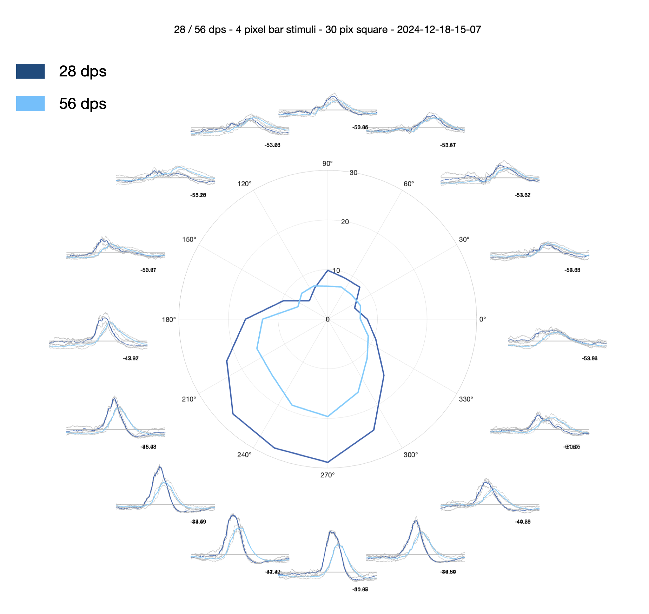 This function plots the timeseries voltage data per condition for each repetition in light grey and the mean response across conditions in light blue for the fast stimuli and dark blue for the slow stimuli. These timeseries plots are positioned in a circle, with each plots position corresponding to the direction in which the bar stimulus was moving. For instance, the plot at the very top of the circle (N position on a compass) corresponds to the response of the cell to a horizontal bar moving from bottom to top. Whereas, the plot at the right of the circle (E position on a compass) corresponds to the response of the cell to a vertical bar moving from left to right. These timeseries plots include the 900ms of interval beforehand and 900ms after the end of the bar stimulus. Thin vertical black lines are added onto the subplot to show these times.