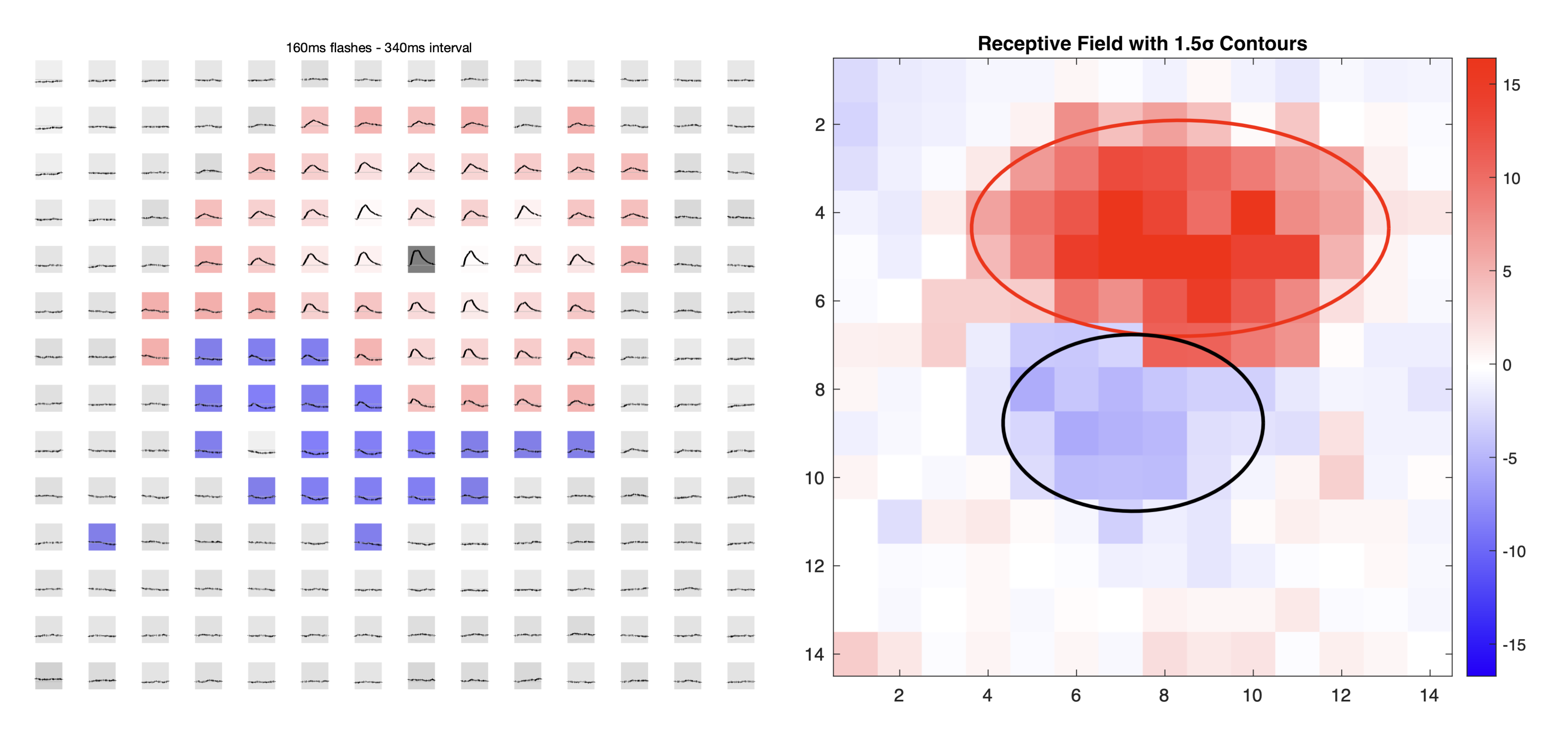 Within process_flash_p2, the code loops through the 4 pixel size flashes and then the 6 pixel size flashes. It makes two receptive field plots for both and stores metrics about the voltage data and the receptive field size and shape in a nested structure rf_results.